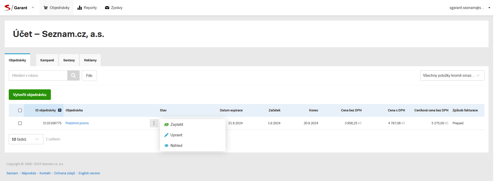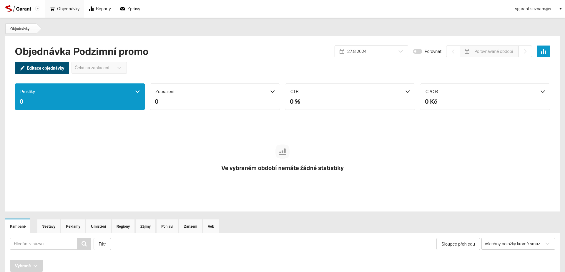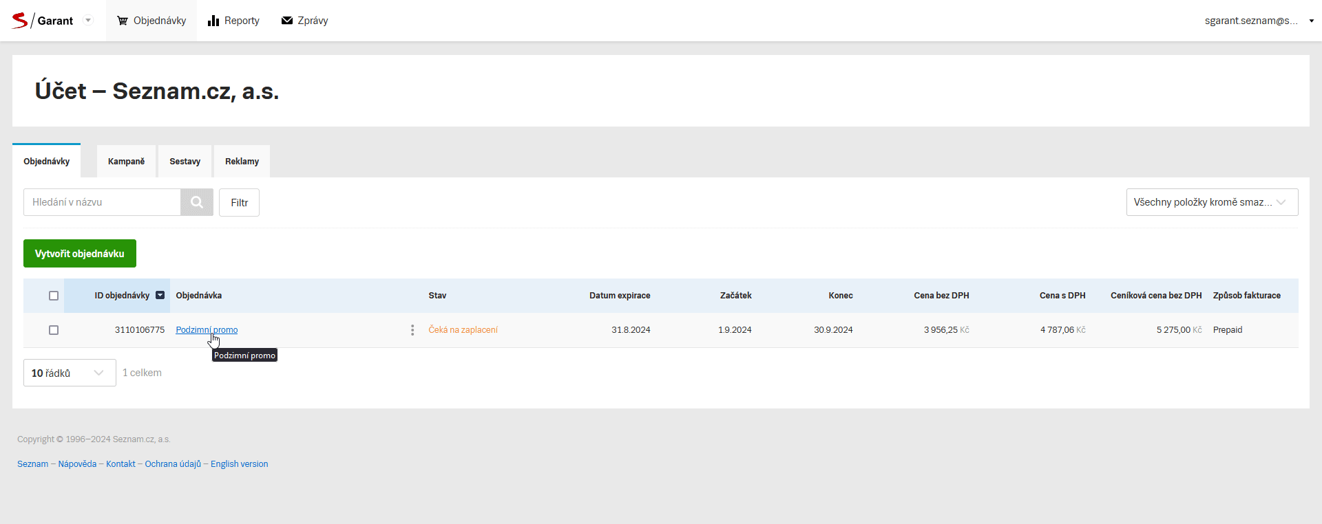 2. Při prokliku přes název se dostanete na přehled Kampaní pod danou Objednávkou.