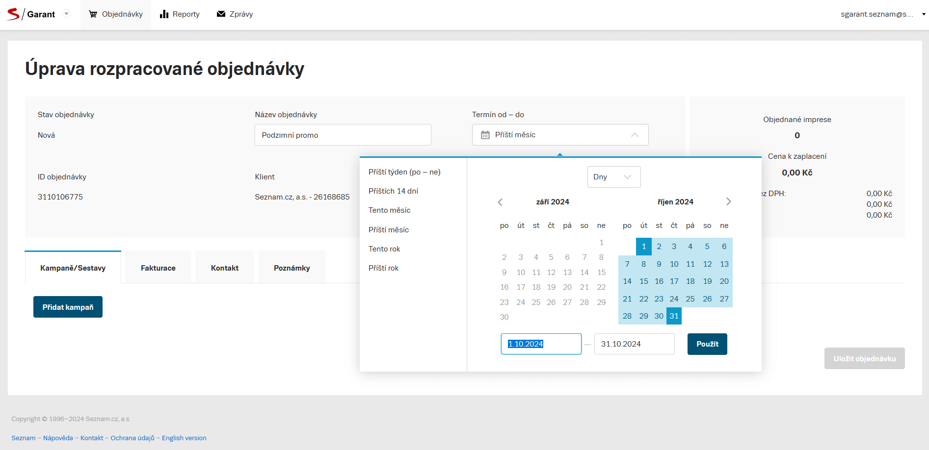 V následujícím kroku vyplníte Název objednávky a Termín od – do.
