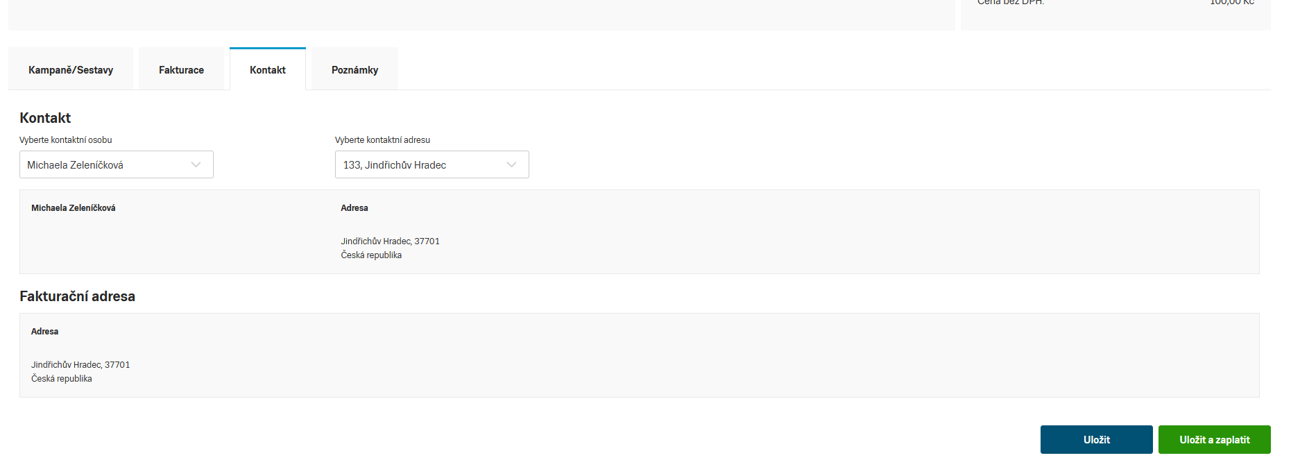 V záložce Kontakt vyberte správnou kontaktní osobu a adresu.