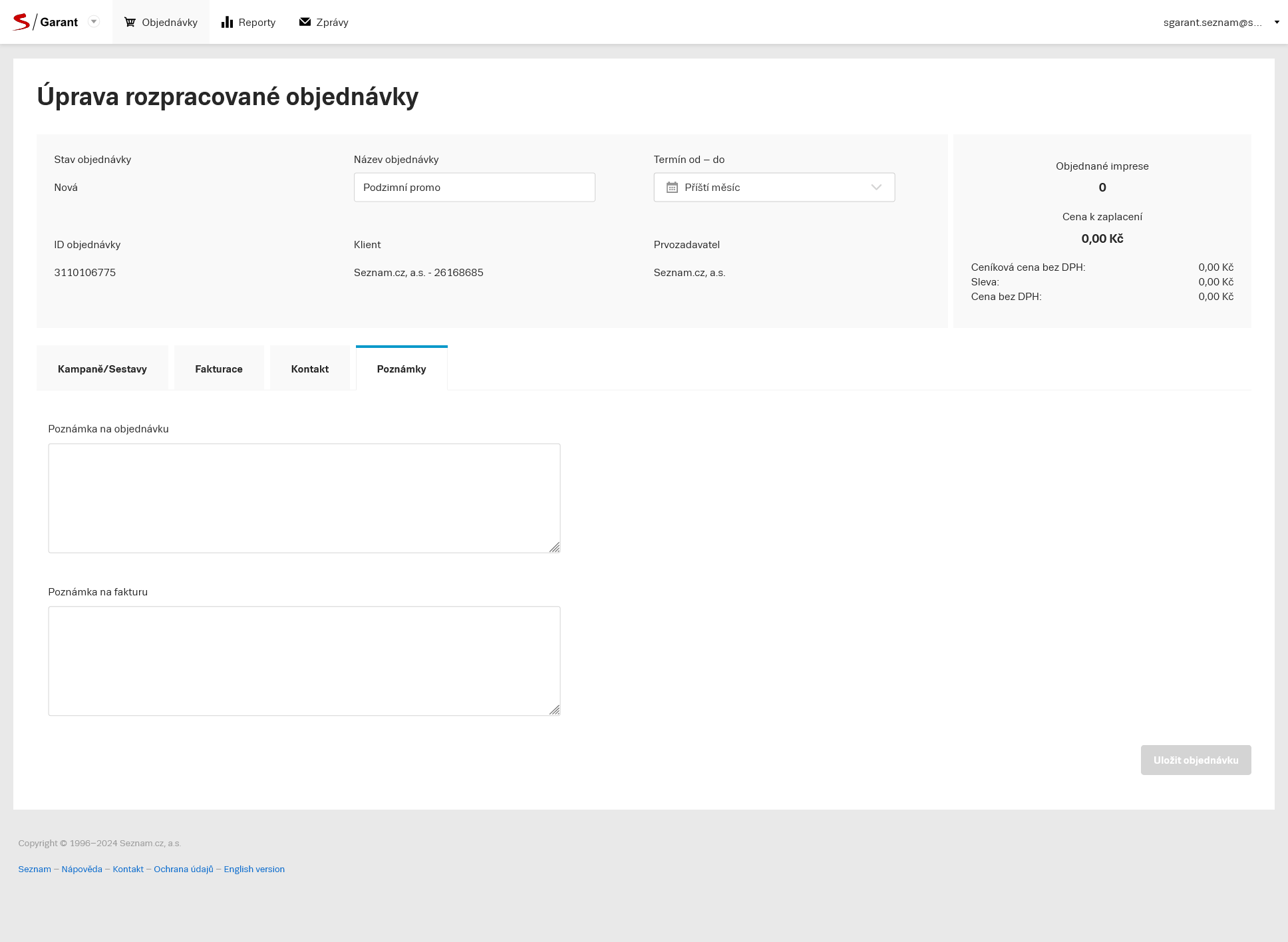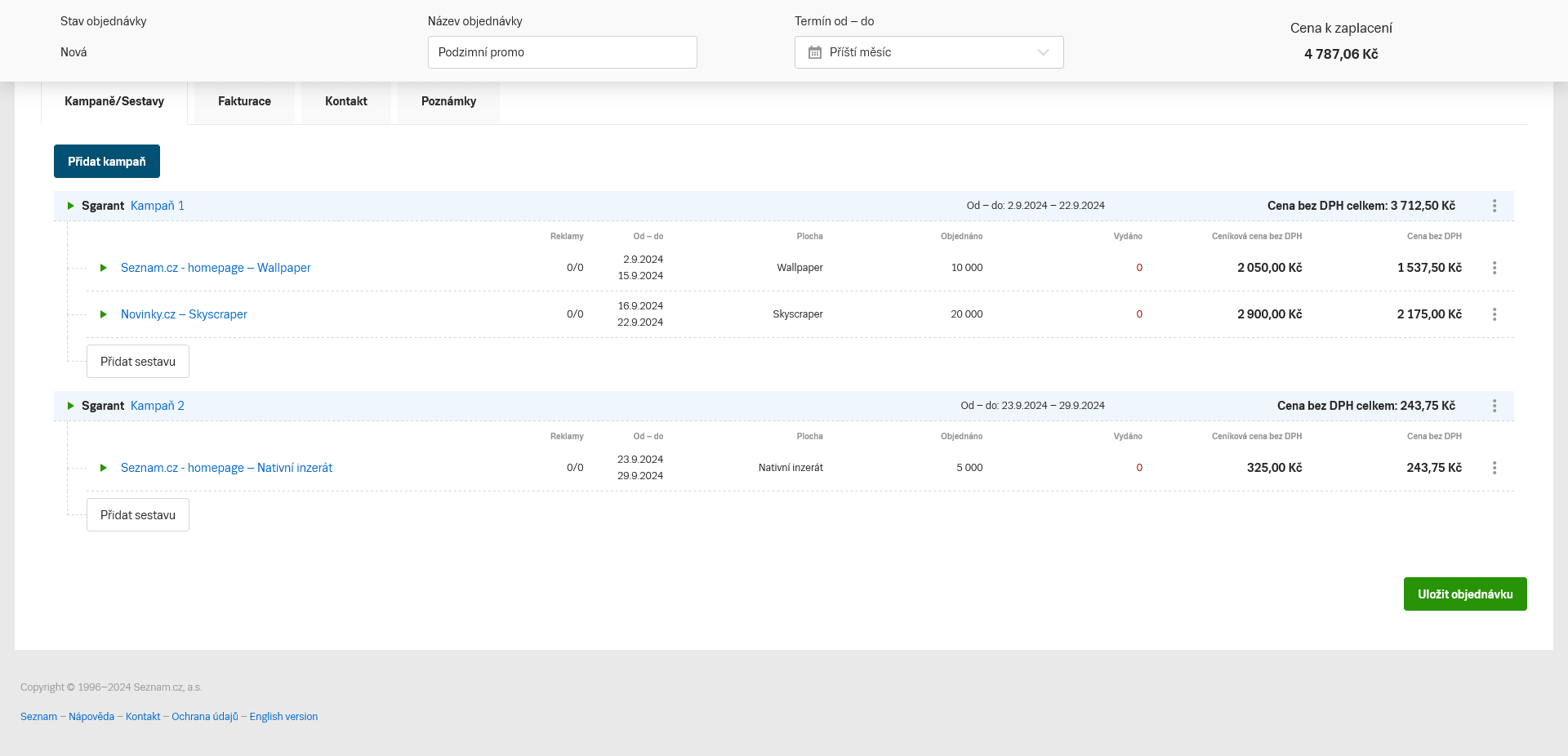 Když je Objednávka / Kampaň / Sestava zadána dle požadavku, nebo po případné editaci, je potřeba Uložit objednávku.