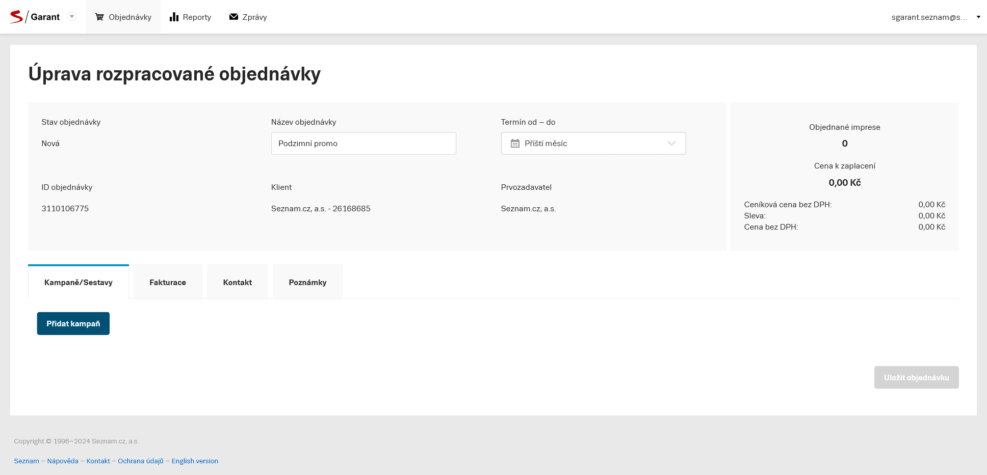 Při vytváření nebo editaci Objednávky a jejích Kampaní / Sestav vzniká tzv. DRAFT (rozpracování objednávky). Objednávku je pak potřeba uložit přes tlačítko Uložit objednávku.