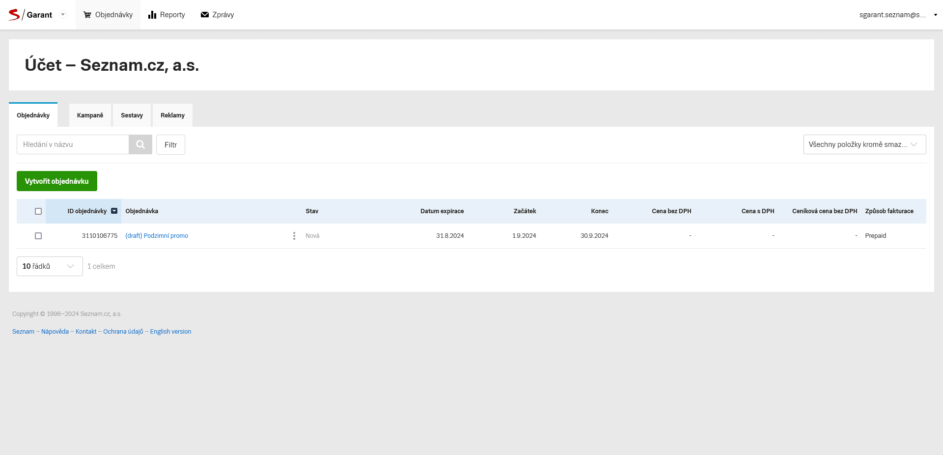 V záložce Objednávky vyberete zelené tlačítko Vytvořit objednávku, které uvidíte po přepnutí do Seznam Garantu.