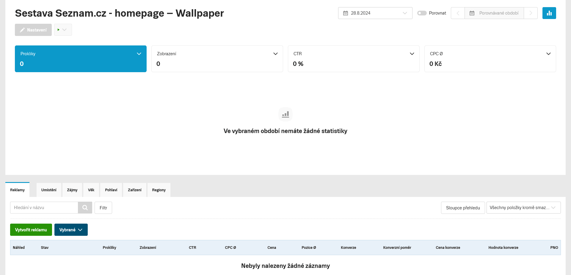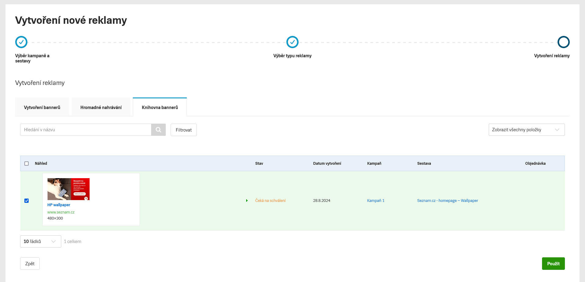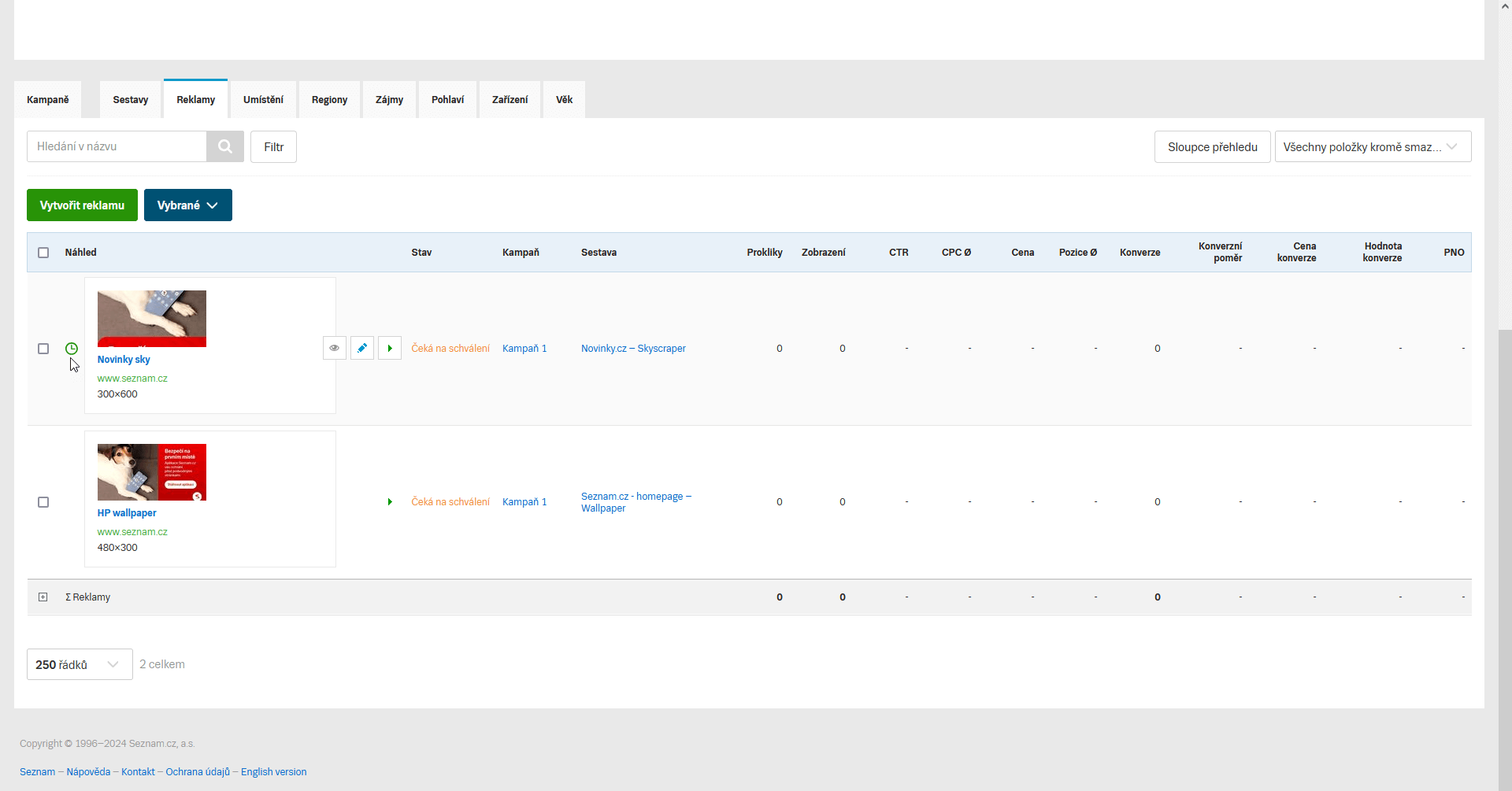 Po prokliknutí vybrané Sestavy se dostanete do přehledu reklam, vyberete Vytvořit reklamu a banner se nahraje k dané sestavě.