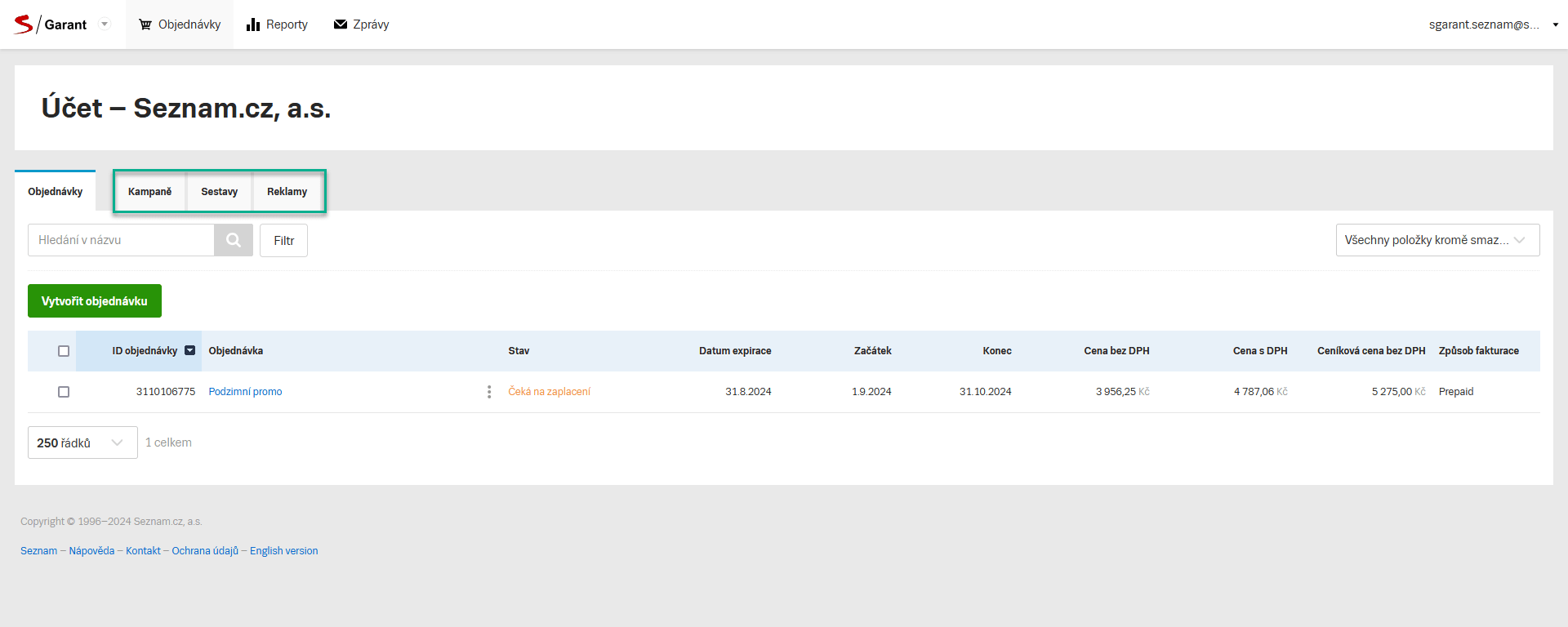 Další způsob je vybrat na záložce Objednávky podzáložku Kampaně, Sestavy nebo Reklamy: