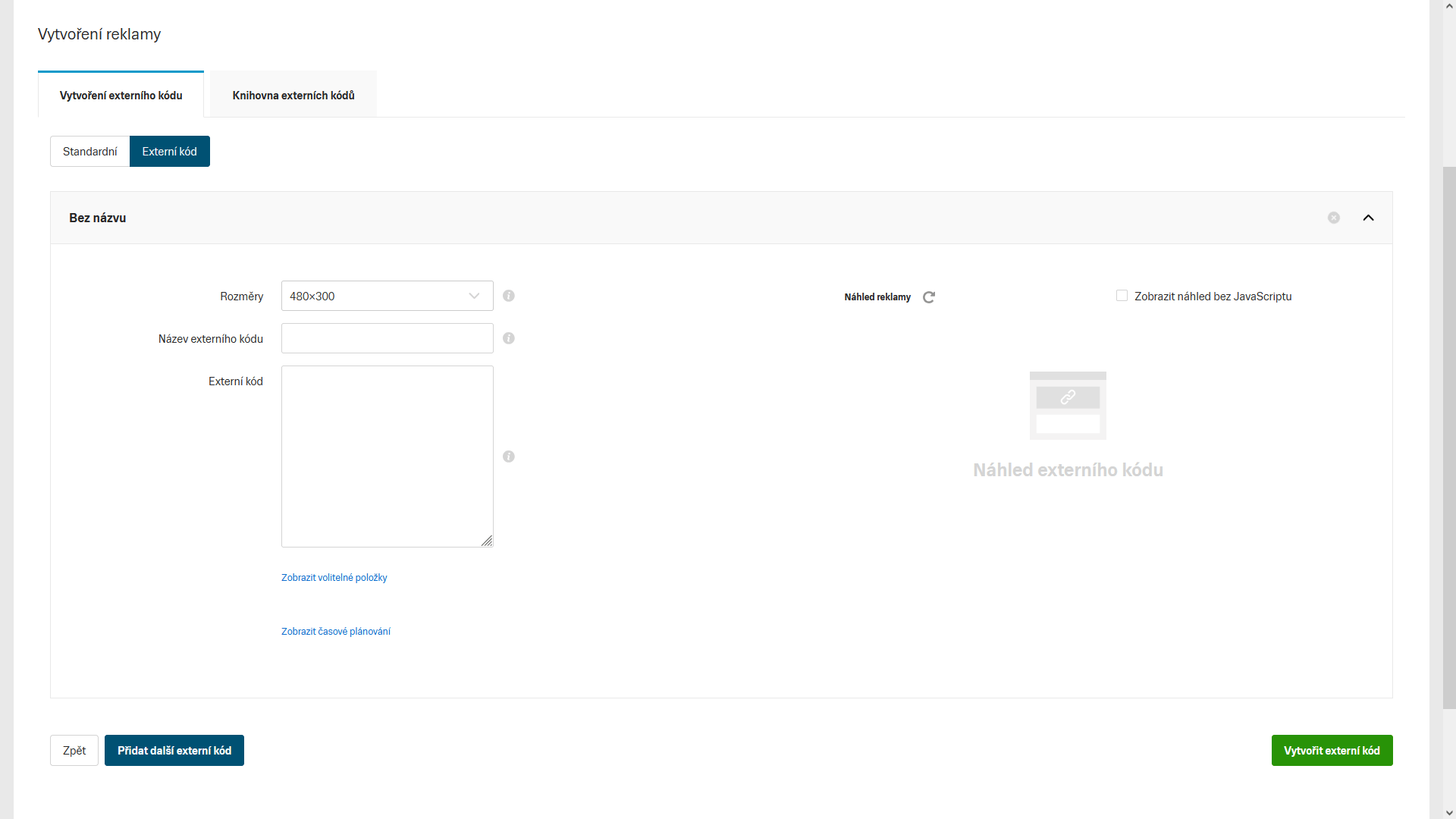 Zvolíte-li možnost Externí kód, zobrazí se vám nový formulář, do kterého kód vložíte a vyplníte všechny povinné položky: