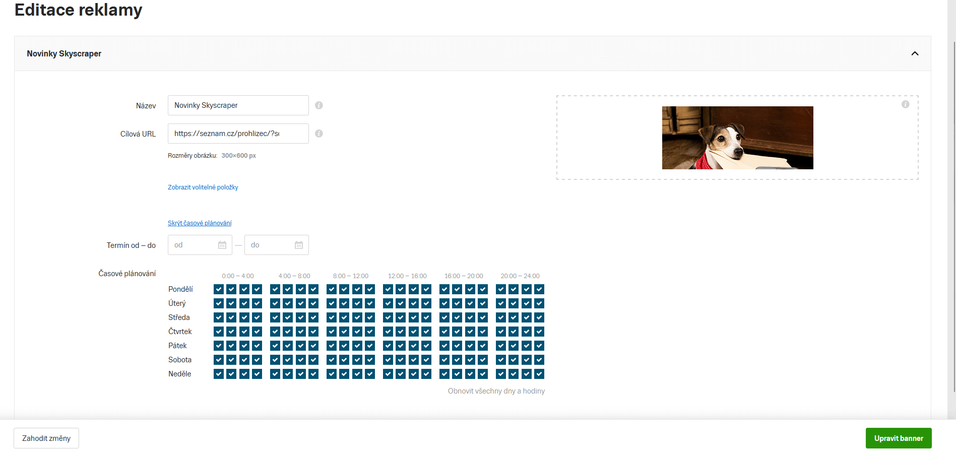 Stejně jako u Sestavy je možné nastavit dny nebo hodiny, kdy se mají které reklamy zobrazovat. Pokud je Sestava běžící (stav Aktivní a Připravená v daném termínu), ale není k dispozici reklama (banner) kvůli nastavenému časovému plánování banneru, imprese se nedohání.