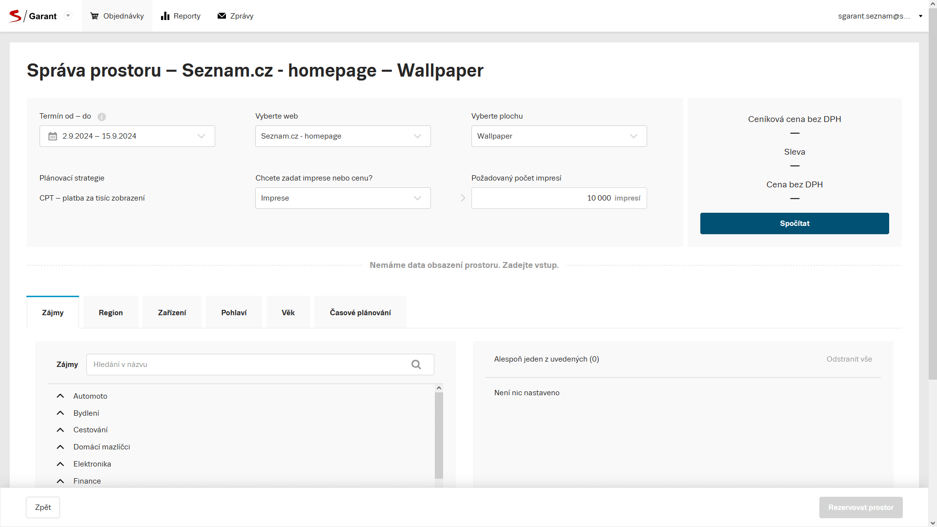 U Sestavy vyplňte Termín od – do, Web, Plochu a Požadovaný počet impresí.