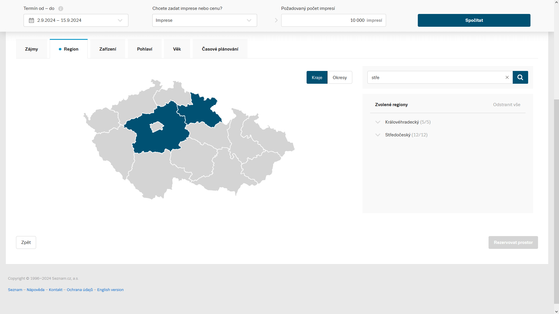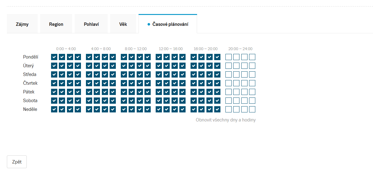 Ve spodní části Správy prostoru můžete dále vybrat cílení na Zájmy, Region, Zařízení, Pohlaví, Věk a nastavit Časové plánování.