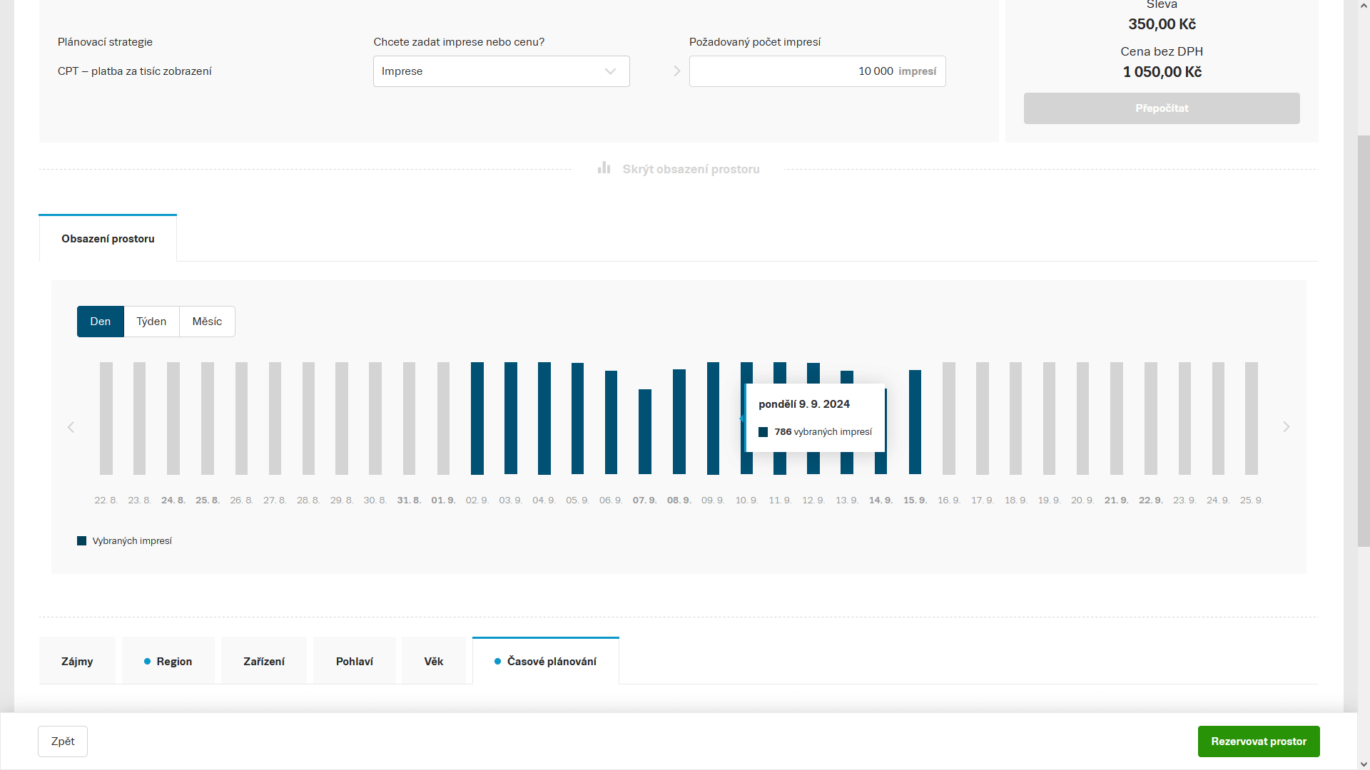 Pokud bude dostatek prostoru, po spočítání predikce se zobrazí graf Obsazení prostoru, který bude po najetí na daný sloupec ukazovat předpokládané rozložení impresí.