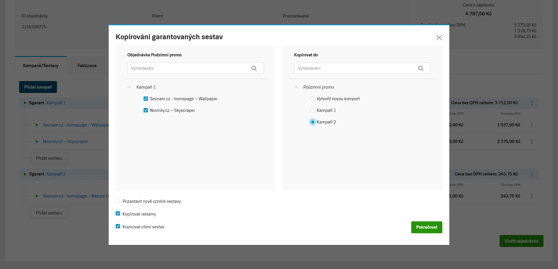 V pravé části pak zvolíte Objednávku a Kampaň, případně vytvoříte novou kampaň v Objednávce, kam chcete zvolené Sestavy kopírovat.