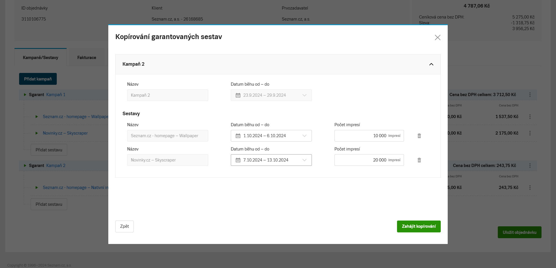 V dalším kroku nastavíte Název kampaně a Datum běhu kampaně, případně si poupravíte sestavy (termín, počet impresí), a kliknete na Zahájit kopírování.