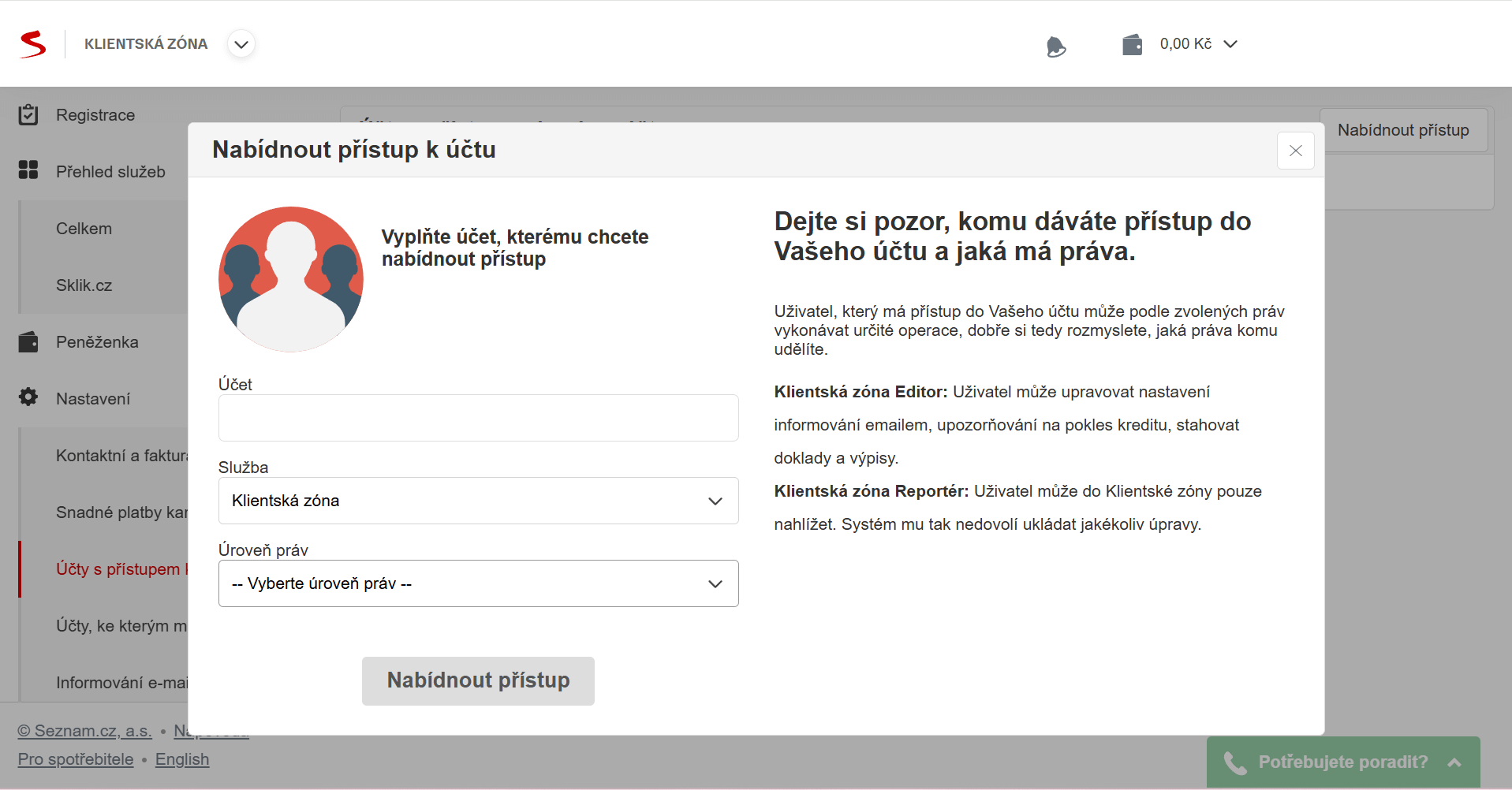 Umožňuje vám sdílet přístup do Klientské zóny s jinými registrovanými uživateli Seznam.cz.