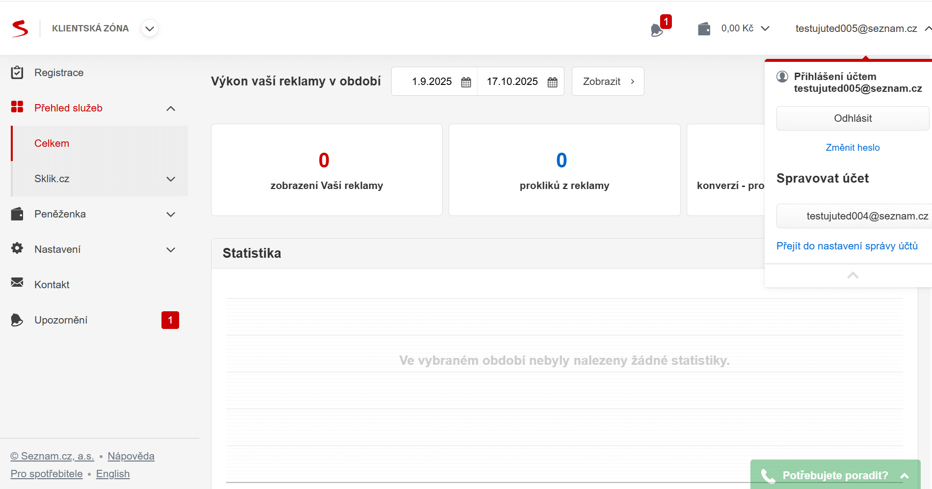 - Do správy Klientské zóny se dostanete automaticky při kliknutí na e-mail u „Spravovat účet“