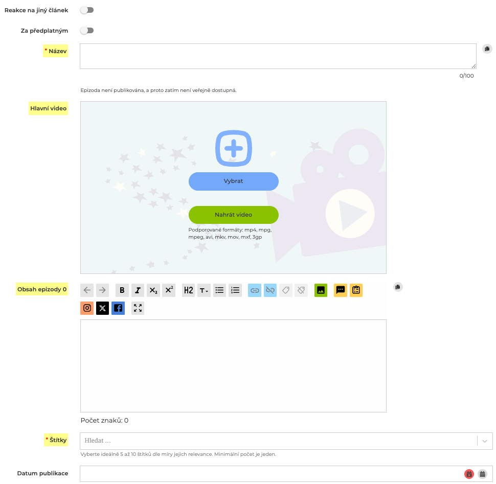 V menu naleznete „Videočlánky (Epizody)“ a přes tlačítko plus u této položky nebo pak ve výpise Videočlánků tlačítkem „Přidat“ se dostanete do vkládacího formuláře.