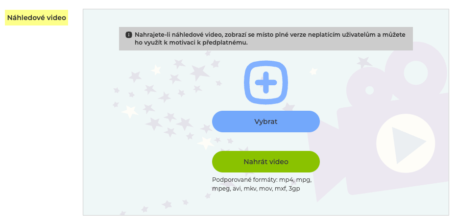 Pokud máte aktivované ve vašem profilu předplatné a rozhodnete se videočlánek dát za předplatné, pak vám formulář zakládání/editace Videočlánku nabídne možnost vložení Náhledového videa.