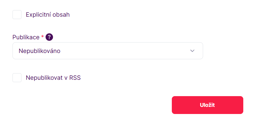 - Volbou hodnoty „Nepublikovat v RSS“ nebude epizoda zahrnuta do RSS a bude pouze na podcasty.cz, případně embedu