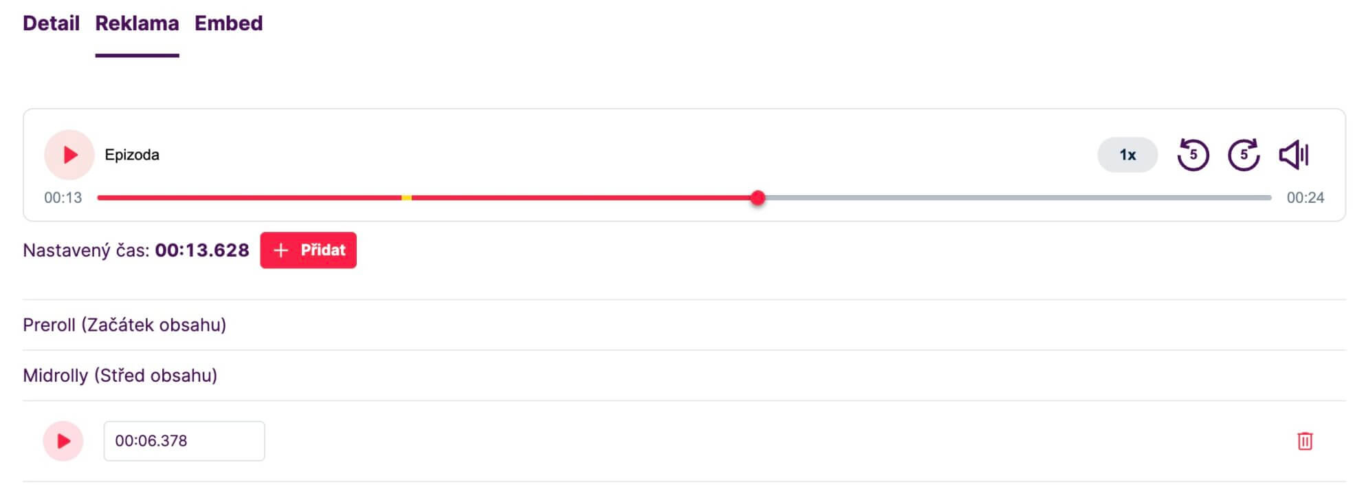 - Do každé epizody je vkládána reklama automaticky na náhodné místo nebo místa v závislosti na délce epizody
