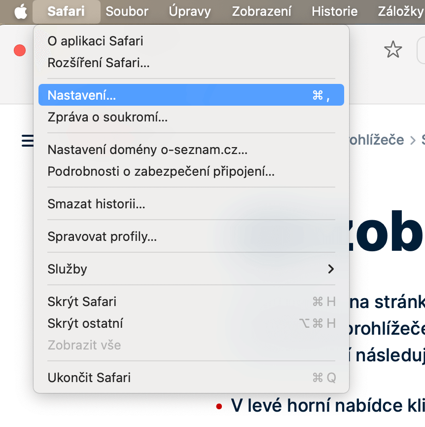 - V levé horní nabídce klikněte na Safari a v menu vyberte Předvolby.