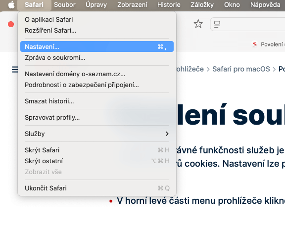 - V horní levé části menu prohlížeče klikněte na „Safari“ a zvolte „Předvolby…„.