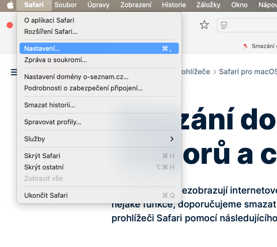 - V horní levé části menu prohlížeče klikněte na „Safari“ a zvolte „Předvolby…„.
