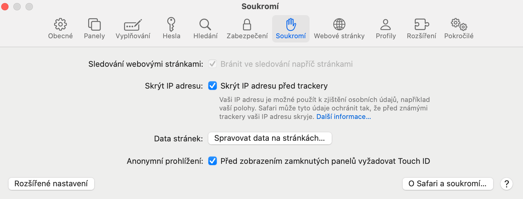 - V části „Soukromí“ klikněte na tlačítko „Spravovat data na stránkách…„