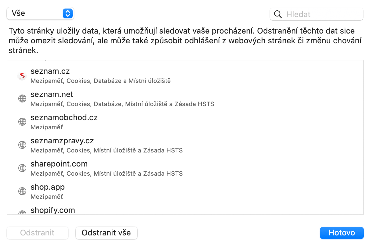 - Zobrazí se seznam uložených dat stránek. V něm klikněte na tlačítko „Odstranit vše„.