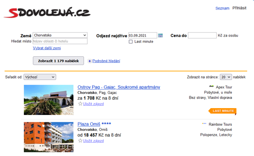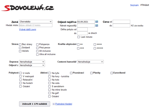 Požadovaný zájezd můžete dohledat pomocí několika možností – zvolením destinace, termínu, ceny, příznakem Last Minute, oblastí, hotelu či kombinací uvedených způsobů.