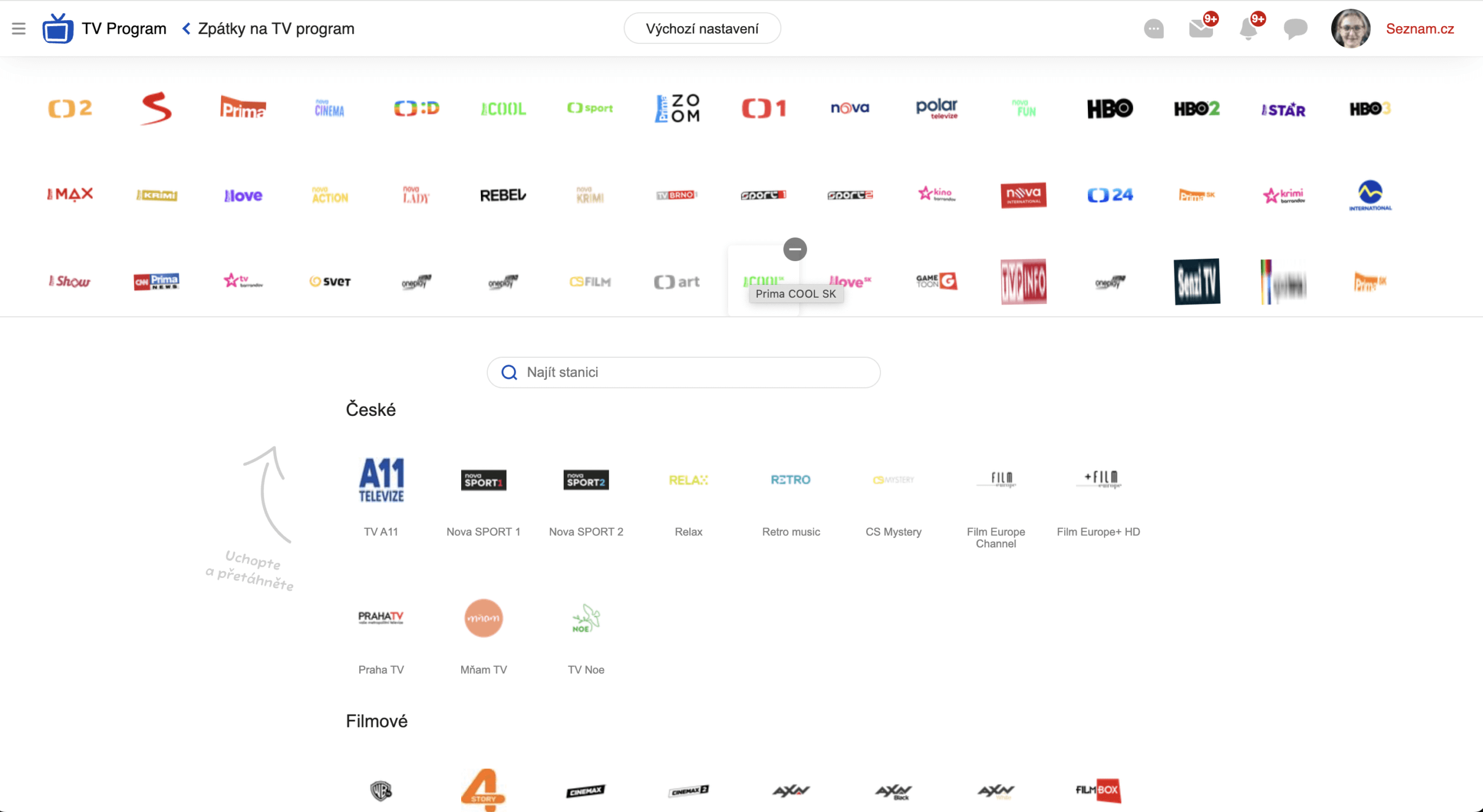 – Podržením a přetažením můžete měnit pořadí stanic. Kliknutím otevřete detail stanice