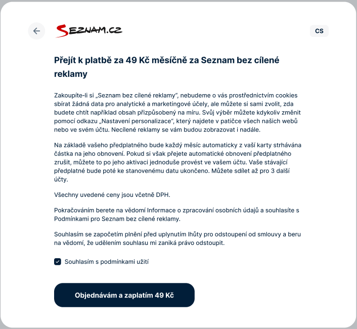 Jakmile zvolíte nesouhlas s vyjmenovanými účely, budete vyzváni k potvrzení přechodu na platbu měsíčního předplatného produktu Seznam bez cílené reklamy.