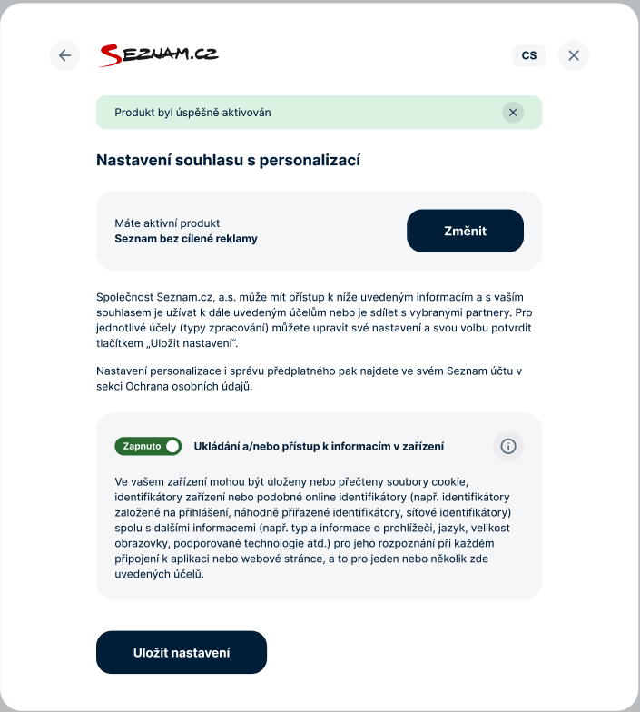 9. Jakmile budete přesměrováni zpět, zobrazí se dialogové okno s detailním nastavením personalizace, kde je již zapsán nesouhlas se všemi účely a potvrzení o aktivaci produktu Seznam bez cílené reklamy. Nyní můžete okno křížkem v pravém horním rohu zavřít, nebo upravit nastavení personalizačních účelů a zavřít tlačítkem Uložit nastavení.