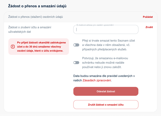Žádost o zrušení účtu a smazání dat odešlete tlačítkem Odeslat žádost.