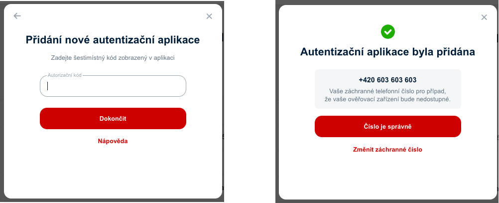 - Potvrzením/aktualizací záchranného čísla dokončíte přidání nového ověřovacího zařízení