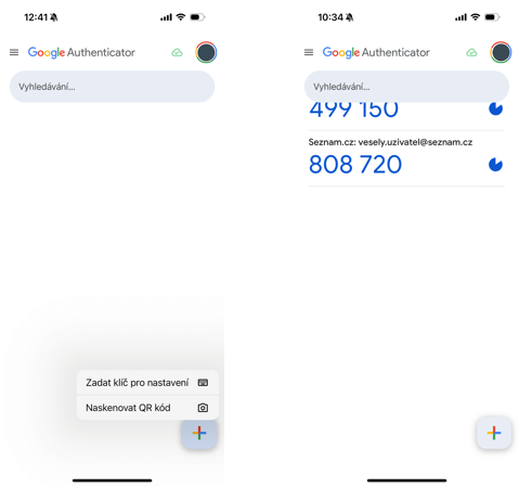 - Po naskenování QR kódu či zadání klíče se váš účet zobrazí v autentizační aplikaci