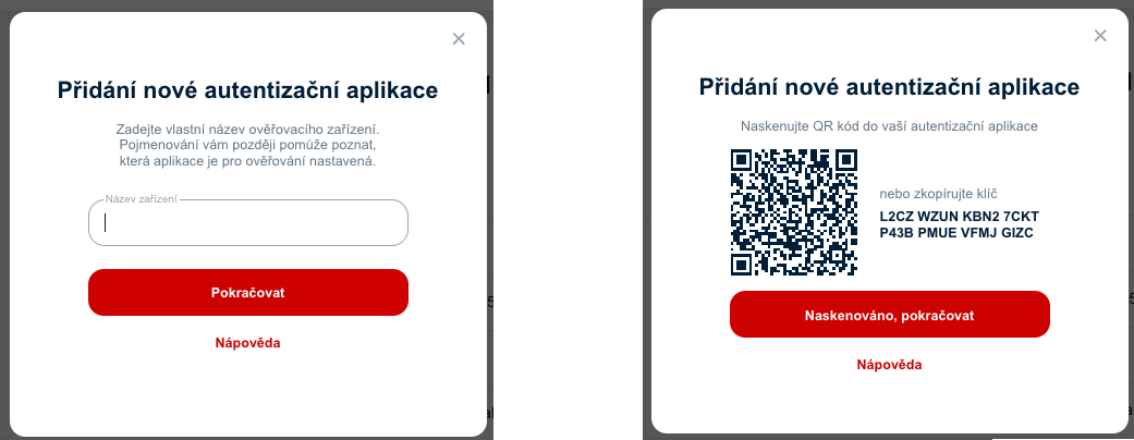 - Po kliknutí na Pokračovat se zobrazí QR kód a alfanumeriký klíč pro přidání účtu do Autentizační aplikace