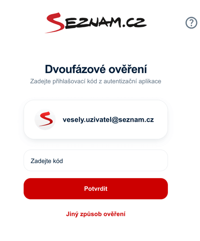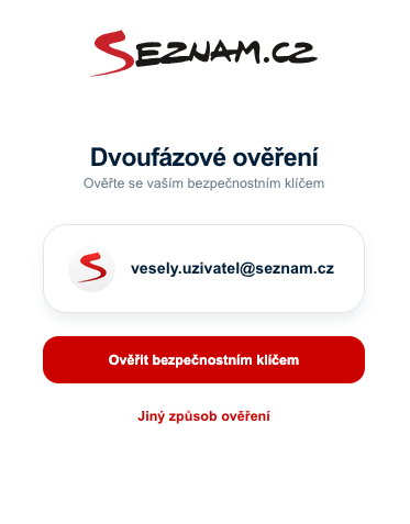 Pokud máte u svého Seznam Účtu nastavené dvoufázové ověřování, budete po úspěšném zadání přístupového jména a hesla vyzvání k zadání kódu z autentizační aplikace či ověření bezpečnostním klíčem.