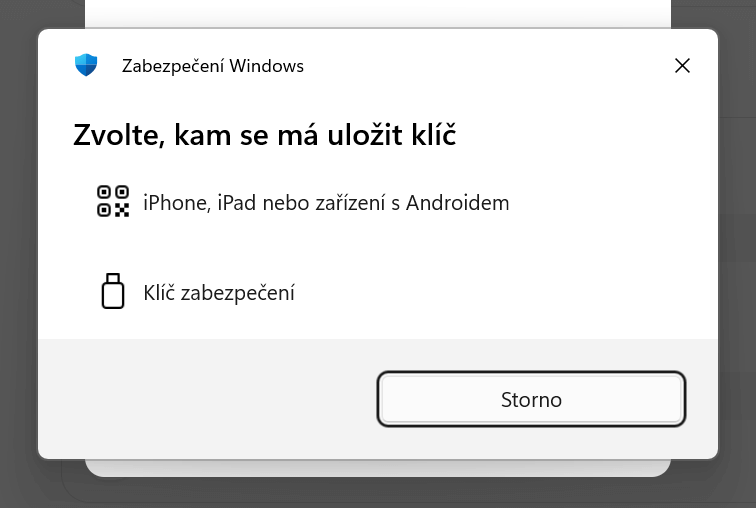 - fyzický bezpečnostní klíč (USB, NFC apod.), nebo