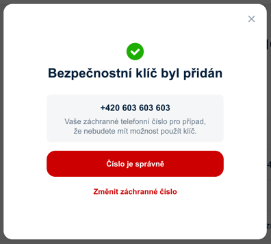 Po úspěšném vytvoření bezpečnostního klíče potvrďte proces zkontrolováním, případně aktualizací svého záchranného telefonníha čísla.