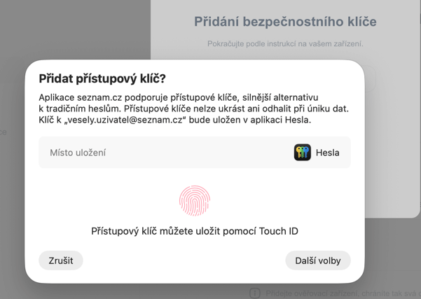 - Bezpečnostního klíče (fyzického nebo uloženého v telefonu)
