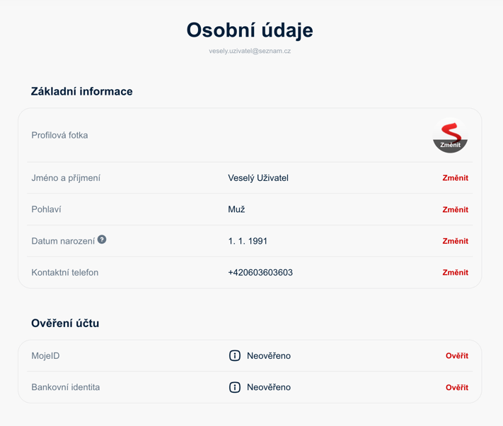 Zobrazí se informace o profilové fotografii, jméno a příjmení, pohlaví, rok či datum narození, kontaktní telefon položky ověření MojeID a Bankovní identitou.