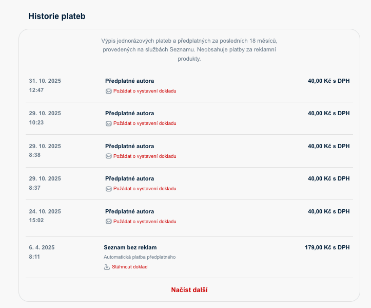 - ke každé platbě si můžete stáhnout doklad či požádat autora o jeho vystavení
