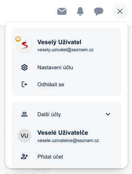 Na většině služeb Seznam.cz najdete v pravém horním rohu tzv. medailonek, ikonku vašeho účtu, která po kliknutí odkryje hlavní nabídku a odhlášení/přihlášení.