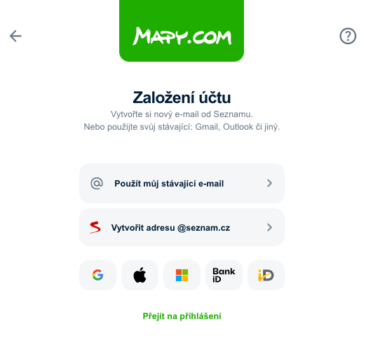 V zobrazeném formuláři klikněte na ikonu dle účtu, který chcete použít. Vyjma klasického formuláře se můžete setkat i s upraveným „zeleným“ formulářem Mapy.com.