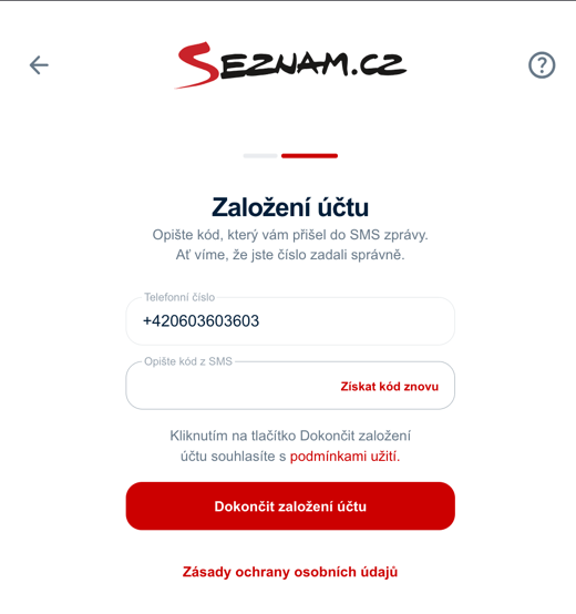 Pokud registraci provádíte na mobilním zařízení, můžete se setkat s nabídkou automatického přepsání potvrzovacího kódu ze SMS.