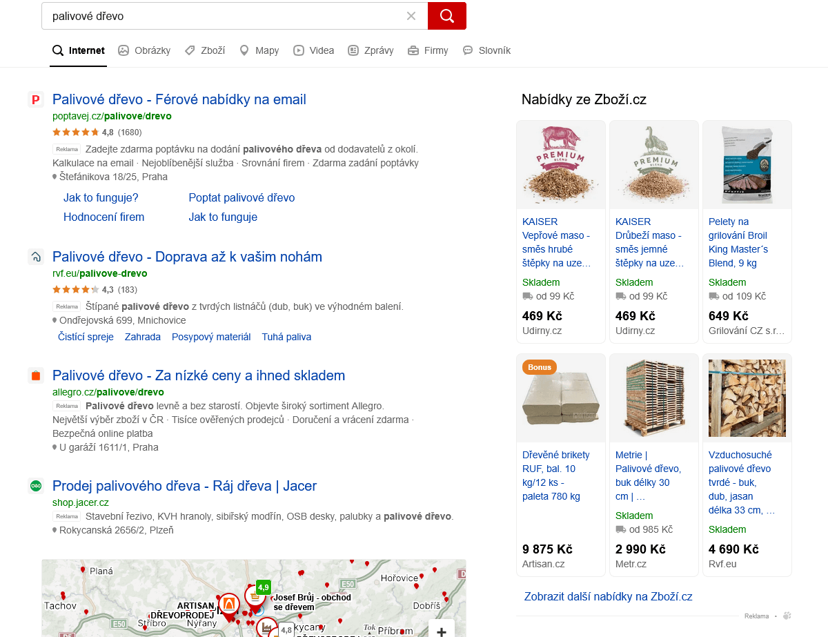 – výsledky, u kterých si klient zaplatil zobrazování na určitou množinu dotazů. Vždy jsou označené nápisem Reklama. Reklama Sklik se může zobrazit i pod přirozenými výsledky vyhledávání. Další informace naleznete na stránce nápovědy Skliku.