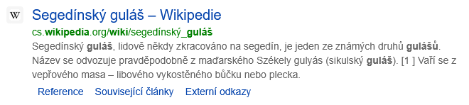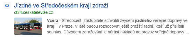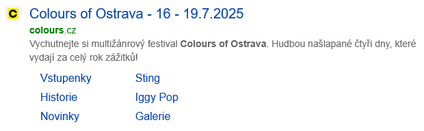 – výsledek obohacený o tzv. rychlé odkazy webu. Jedná se o takové odkazy, které jsou uvedeny na homepage daného webu, odkazují na dokumenty ze stejné L2 domény a jsou pro uživatele nejvíce přínosné. Jejich popisky přebíráme z homepage daného webu a nijak je nemodifikujeme.