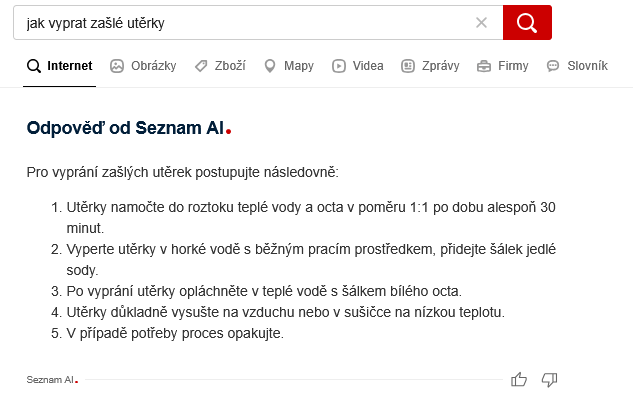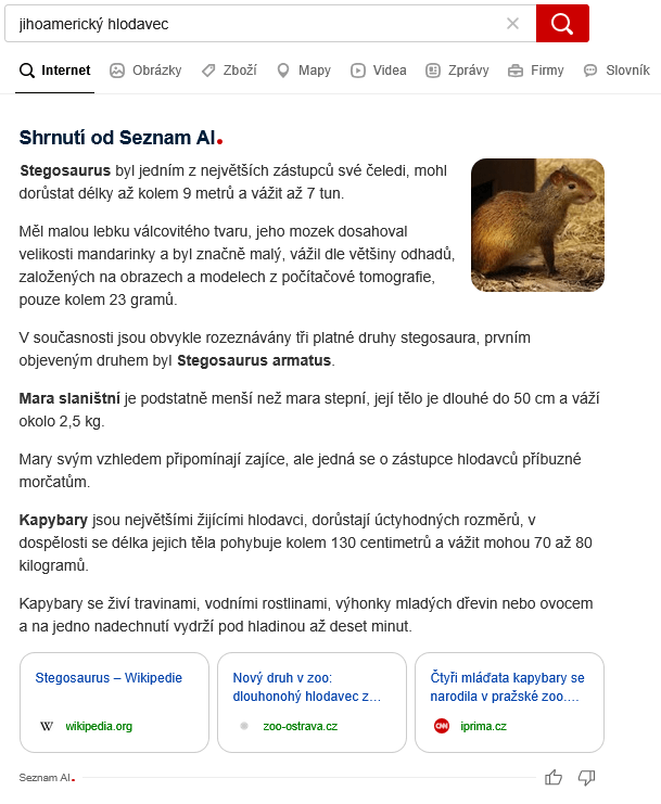 Ve výsledcích vyhledávání se můžete potkat s prvkem, který obsahuje přímou odpověď na váš dotaz tak, jak ho zodpověděl náš velký jazykový model. Zdrojem odpovědi jsou v takovém případě data, na kterých byl model naučen.