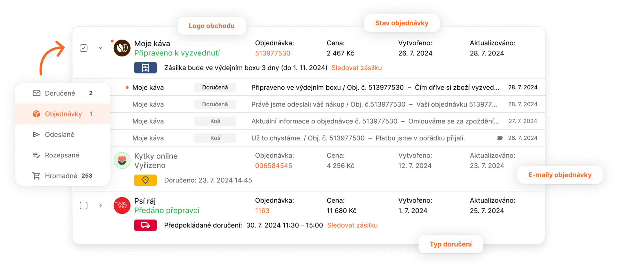 Z přehledu objednávek jsou snadno dostupné i související e‑mailové zprávy. Zákazník tak snadno najde fakturu nebo kontakt na vaši zákaznickou linku.